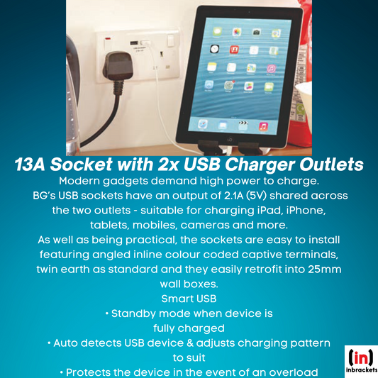 Double Wall Plug Socket 2 Gang 13A with 2 USB Charger Port Outlets White Plate - Pack of 2