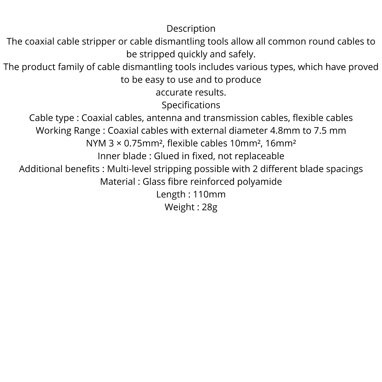 • Two or three-level stripping of all common coaxial cables with a diameter of 4.8 to 7.5mm,