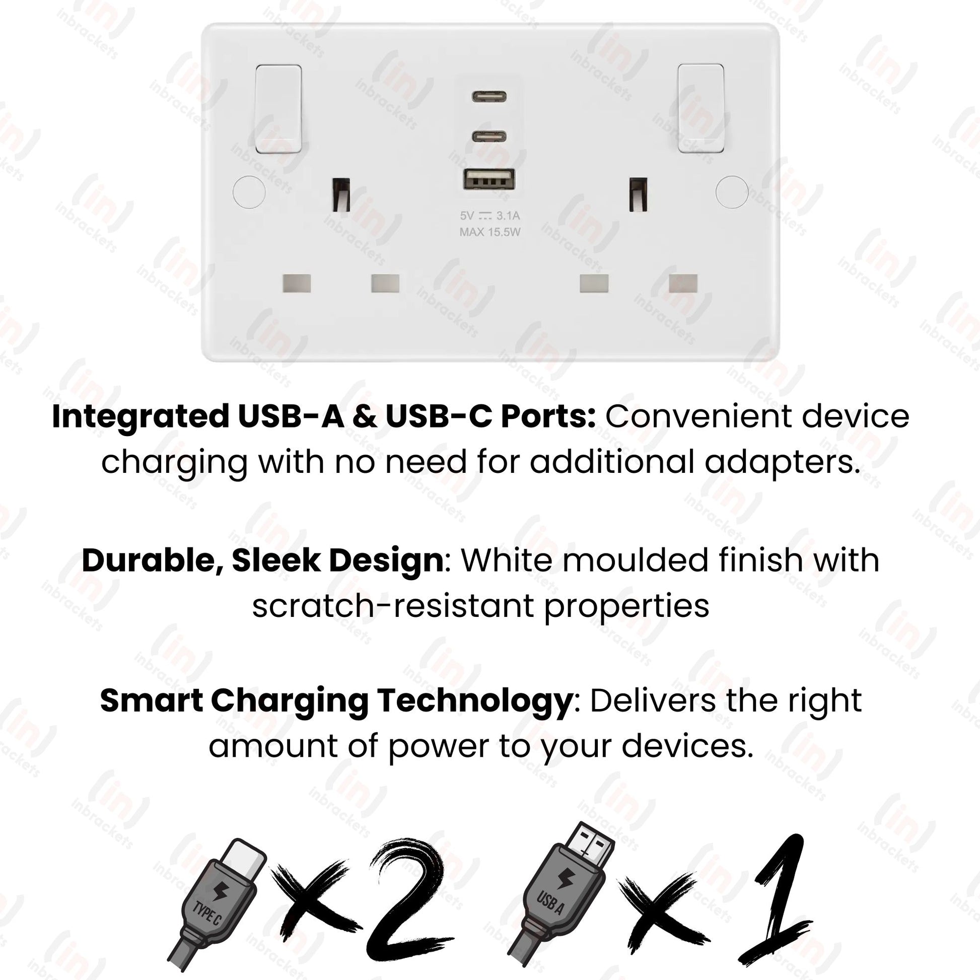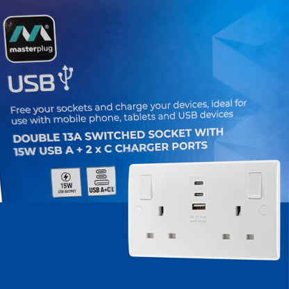 Double 13A Switched Socket with 15W USB A & 2 x C Charger Port Masterplug