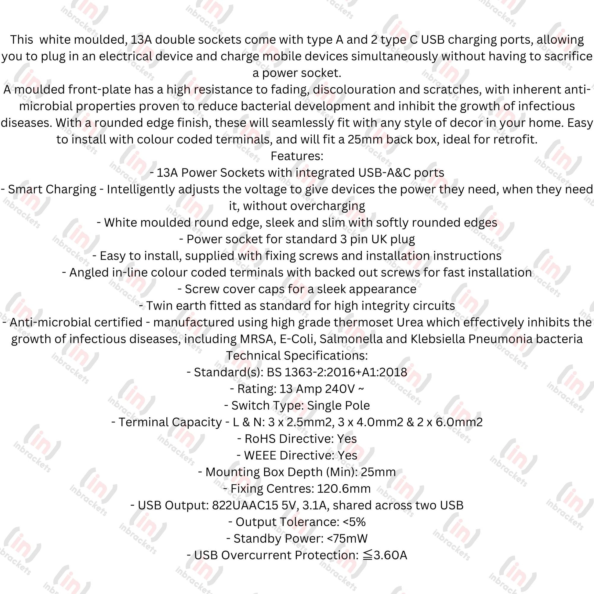 - Dual Power Outlets & USB Ports: Two standard 13A sockets with one USB-A and two USB-C ports for simultaneous device charging.