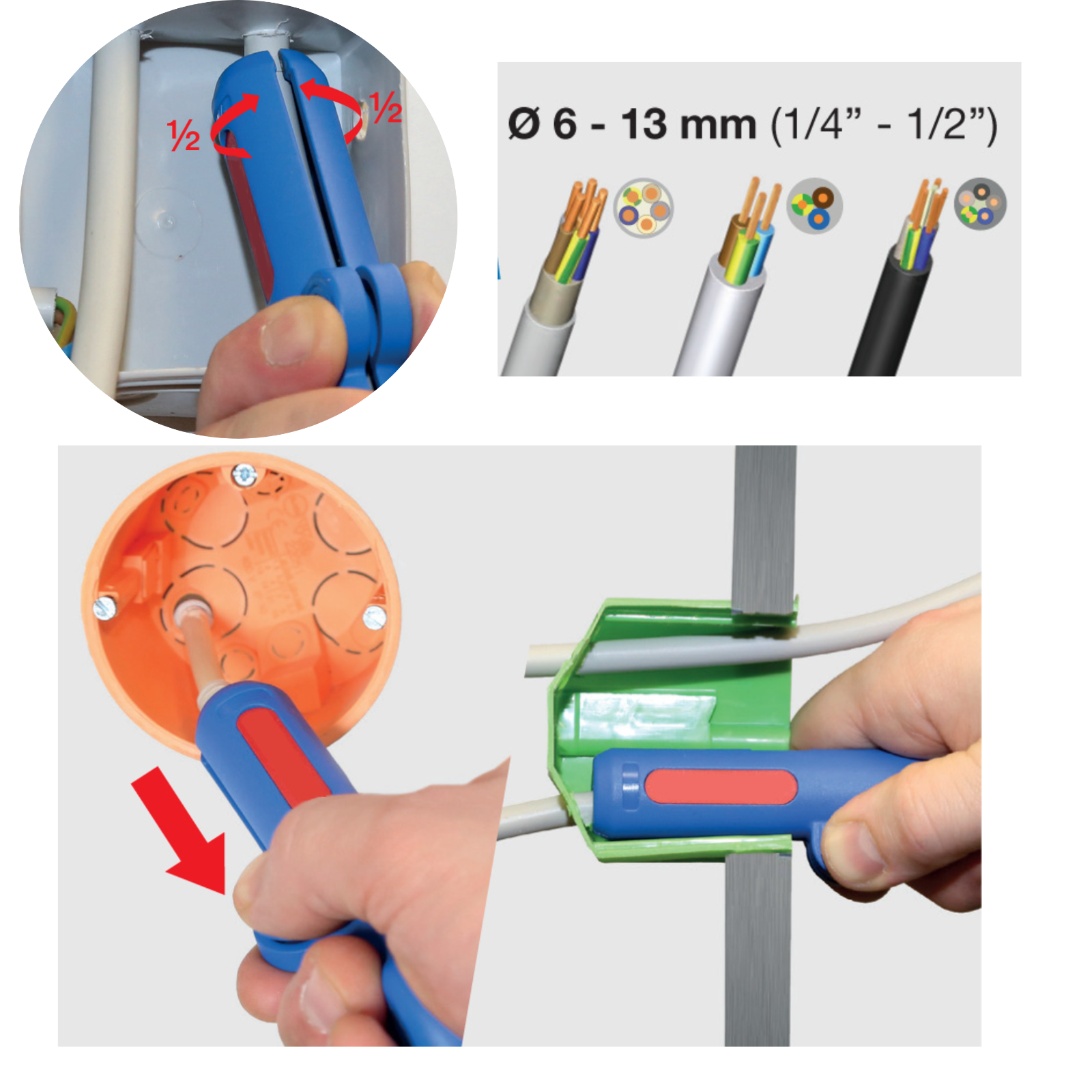 This German Made professional Cable Stripper allows round cable to be stripped quickly and safely. It is easy to use and allows safe and comfortable stripping of all common round cables with a diameter of 6mm to 13mm